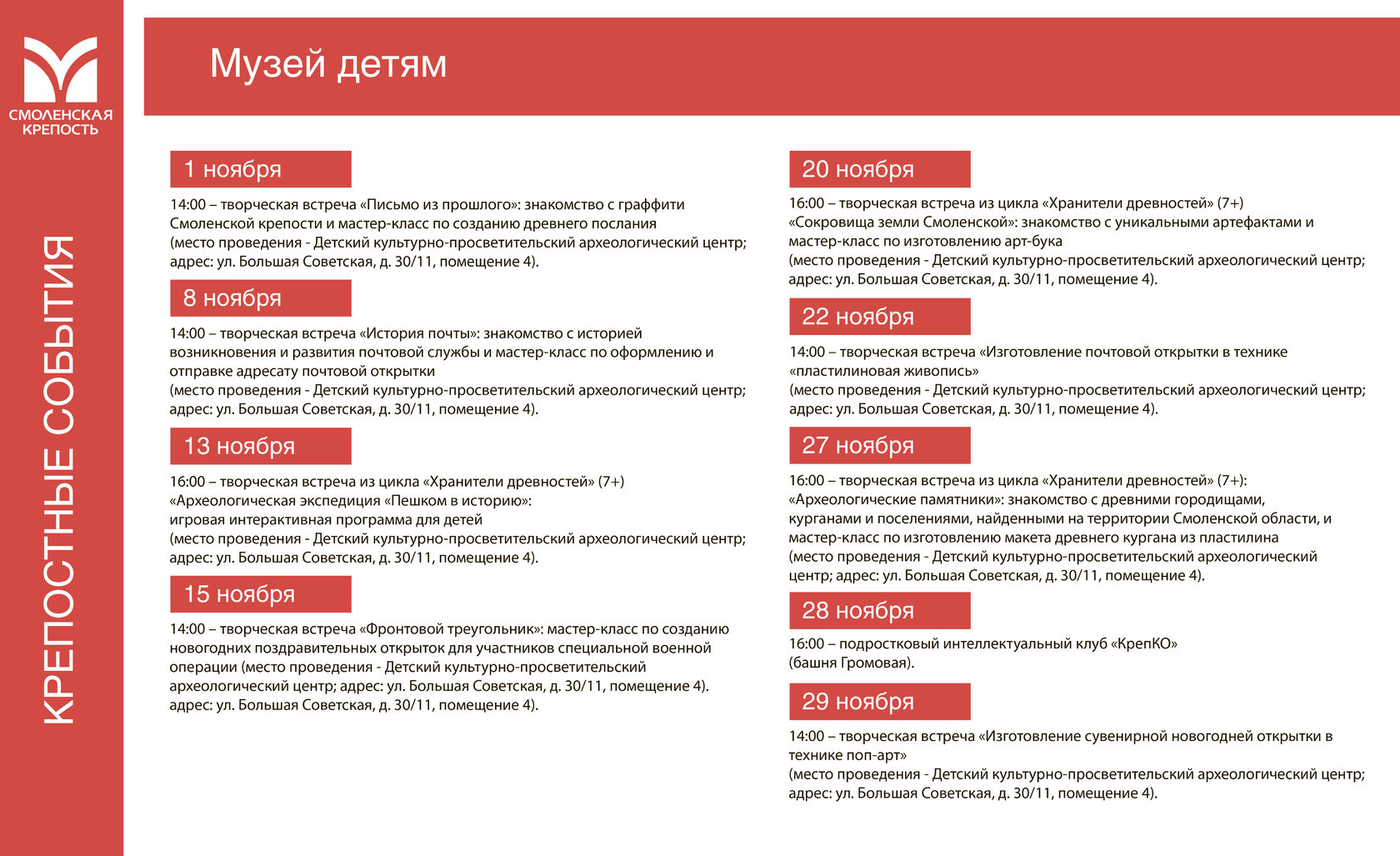 20 ноября, 16:00 – творческая встреча из цикла «Хранители древностей» (7+). «Сокровища земли Смоленской»: знакомство с уникальными артефактами и мастер-класс по изготовлению арт-бука.