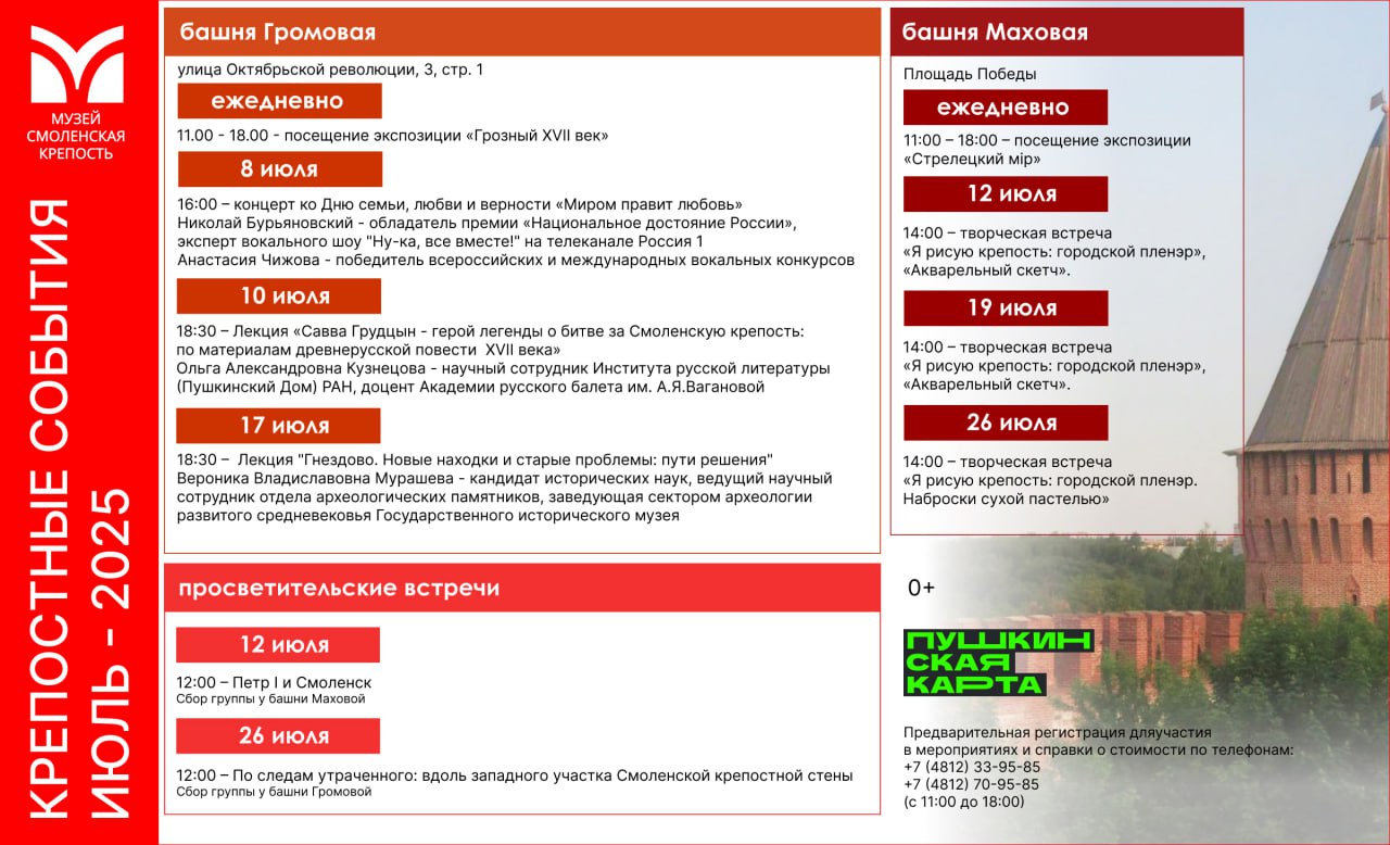 В июле Государственный музей «Смоленская крепость» приглашает смолян и гостей города на увлекательные мероприятия, которые позволят глубже погрузиться в историю Смоленска и его знаменитой крепости